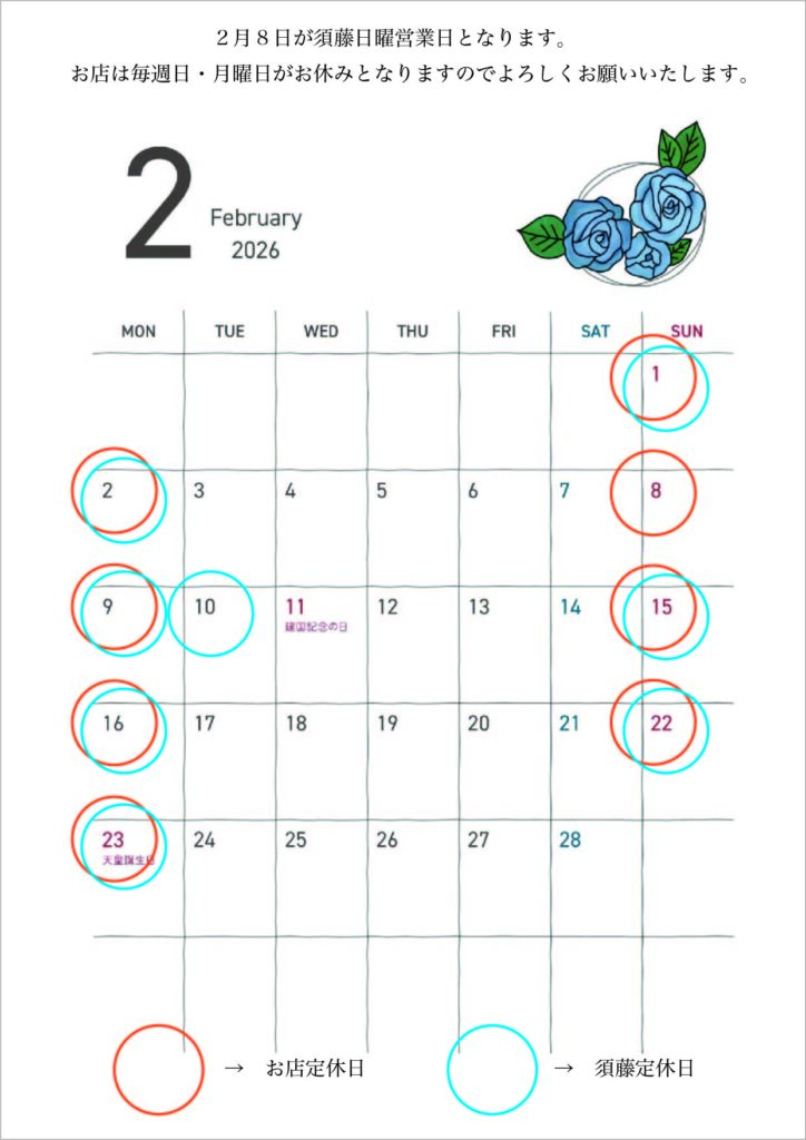 2026年2月のお休みお知らせ。